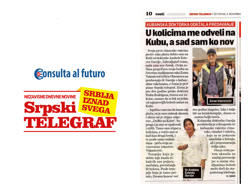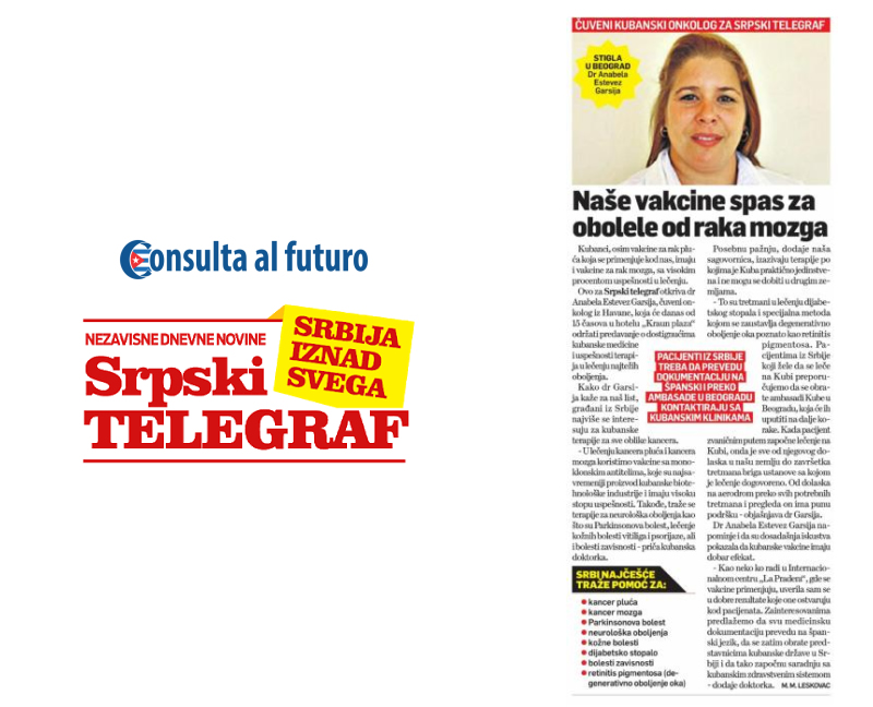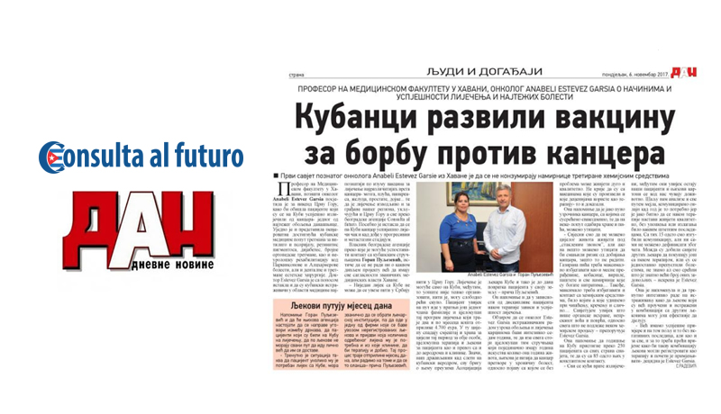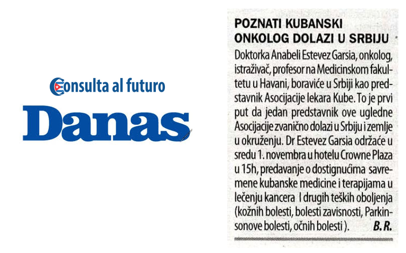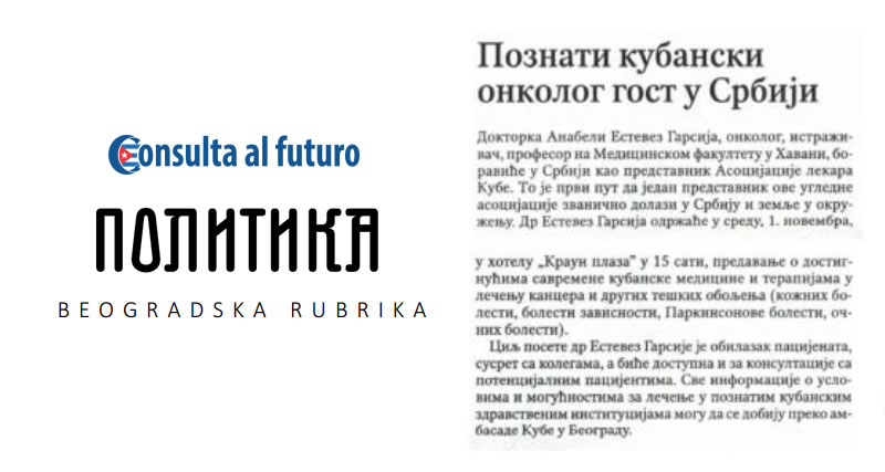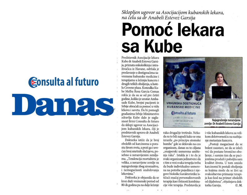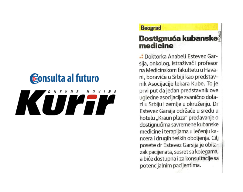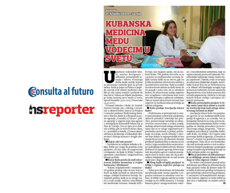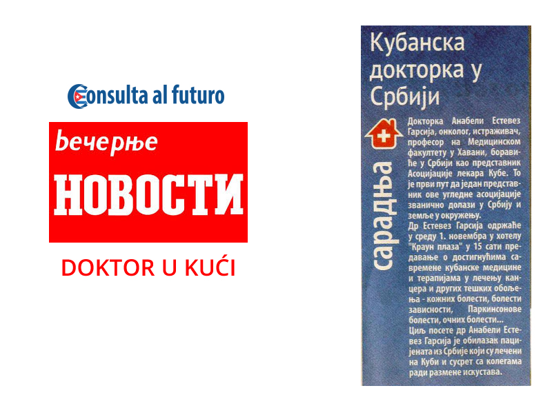 Posete dokotra sa Kuba u organizaciji agencije Consulta al futuro kao jedine agencije sa ovih prostora koja ima dozvolu kubanskog ministartstva zdravlja ispraćena je ne samo u TV i online medijima već i u štampanim medijma. Različiti mediji u Srbiji i regionu su pisali o dostignućima kubanske medicine, mogućnostima lečenja kancera i drugih opakih bolesti, kao i iskustvima pacijenata koji su iz Srbije išli na lečenje na Kubu.